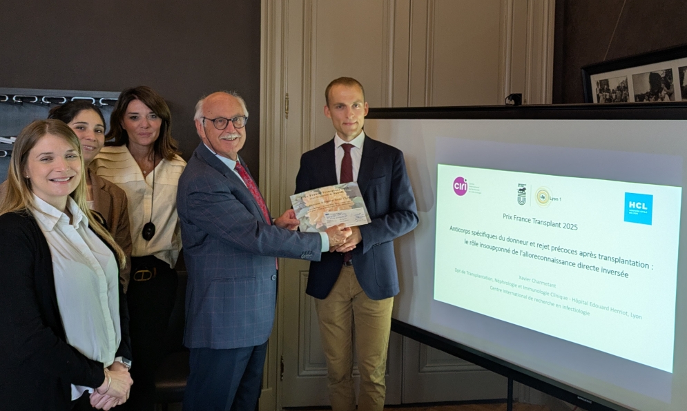 Ce jeune médecin-chercheur a reçu le chèque de 6500€ des mains du Pr Jean-Louis Touraine, président de France Transplant, en présence de membres du jury, de responsables de Sanofi, de membres de France Transplant et du Pr Olivier Thaunat, responsable du laboratoire (INSERM et hôpital E. Herriot) où a travaillé le Dr Charmetant.